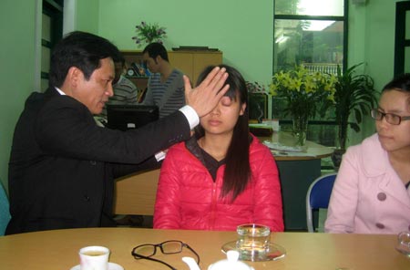 Thạc sĩ Nguyễn Mạnh Quân đang ứng dụng thôi miên cho nữ sinh Đại học Thăng Long.